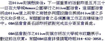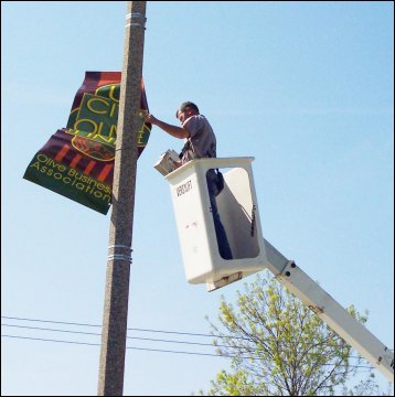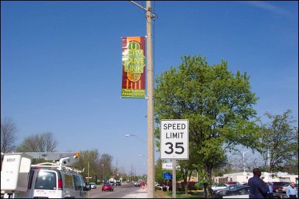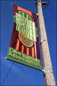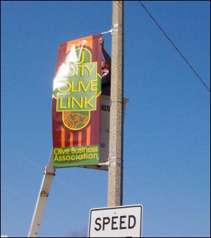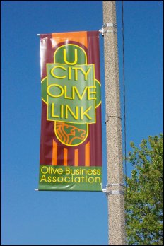 The hanging of the banners is just the beginning of OBA plans for this Spring. A special event, "Experience the U City Olive Link" will be held following the University City Memorial Day Run and in conjunction with the Snip/Dig celebration and groundbreaking for renovations on the Heman Park Pool and Recreation Center, is scheduled for Monday, May 31, 2004 from 12 noon to 5:00 PM.
