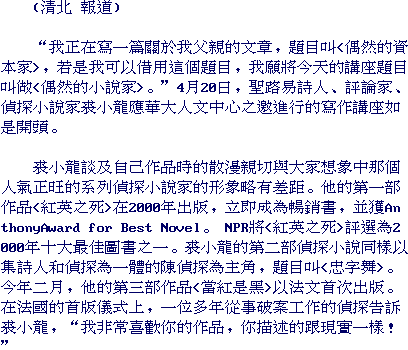 Death of a Red Heroine, Qiu's first novel in English, received a 2001 Anthony Award for First Novel and was the first of Qiu's "Detective Chen" series, which follows the exploits of a police inspector, whose job sometimes brings him into conflict with upper echelons of the Chinese Communist party. The character's background in English language and literature makes him an ideal host for American visitors, with whom he can discuss his love of Western literature, from T.S. Eliot to Faulkner.