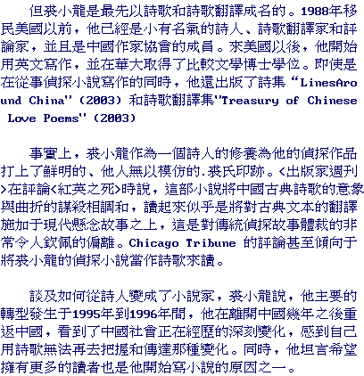 To a Western reader, the characters in Qiu's novels quote poetry with unusual frequency. Qiu explains that "Most novels in China contain much more poetry [than Western novels], at the start of the chapter, at the end, and in the middle - and sometimes they use a poem to introduce a new character. I tried to keep this kind of Chinese tradition." Using poetry, Qiu observes, "can be a way of discreetly revealing character. China has a self-effacing culture, it's better not to say what you want to say immediately."