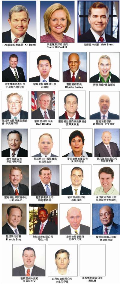 Participants in the trade mission to China include Gov. Matt Blunt, U.S. Senators Kit Bond and Claire McCaskill, U.S. Rep. Russ Carnahan; St. Louis Mayor Francis Slay; St. Louis County Executive Charlie Dooley; and former Mo. Gov. Bob Holden who serves as the Vice Chairman of the Midwest U.S.-China Association and was invited by Gov. Blunt. Business leaders include Richard C. D. Fleming, president and CEO of the St. Louis Regional Chamber & Growth Association (RCGA); David L. Steward, chairman and CEO of World Wide Technology; and executives with Pfizer, Peabody Energy, Unigroup, McEagle Properties, the World Trade Center St. Louis, and Lambert St. Louis International Airport.