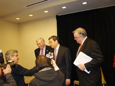| Chinese Ambassador to the United States Zhou Wenzhong (R) meets the media with U.S. Senator Kit Bond at the opening ceremony of the new Midwest/China Hub Commission in St. Louis, United States, Jan. 26, 2009. |