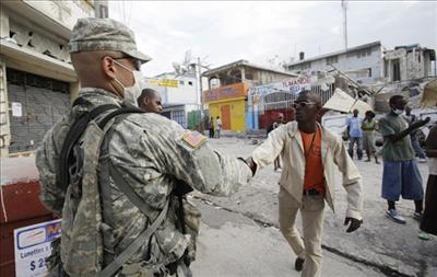U.S. Army Pvt 1st Class Michael Segura, of the 82nd Airborne, left, is greeted by a man as he stands guard outside the cathedral in Port-au-Prince, Tuesday, Jan. 19, 2010. The U.N. Security Council approved extra troops and police officers to beef up security in Haiti and ensure that desperately needed aid gets to earthquake victims. - AP Photo