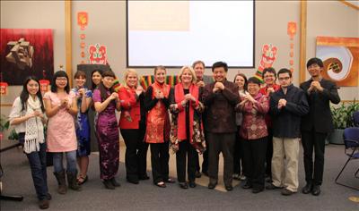 | Lift For Life Academy高中中文老師黃育德(左一)與其學生一同參加孔子學院新年活動 |