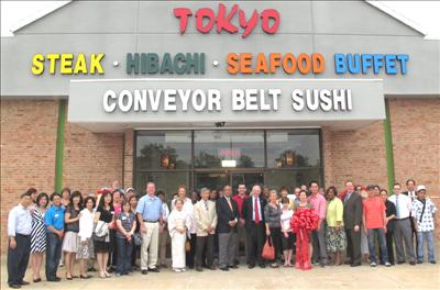 25日當天上午11時鑼鼓喧天,東京海鮮自助餐廳開幕剪綵儀式正式開始,由聖路易郡郡議員Hazel Erby、密蘇里州眾議員Rory Ellinger 、聖路易市主計長Darlene Green、聖路易財政局局長Eugene Leung、聖路易郡估稅長Jake Zimmerman、聯邦參議員Claire McCaskill地區主任Mattie Moor、大學城市長Shelley Welsh、市政經理Lehman Walker、聖路易郡社區發展主任Joanne Gladney、聖路易郡衛生局主任秘書Joyce Theard、Commerce Bank第一副總裁Norman Appelman、聖路易郡委員羅彥豪夫婦、聖路易國際機構總裁Anna Crosslin、聖路易日美協會會長Chikako Usui教授、美華協會會長Thong Tarm、及前會長Eling Lam等中外貴賓百餘人出席參與,共同主持剪綵儀式,場面熱鬧非凡。