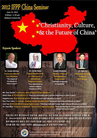 【聖路易時報訊】位於大聖路易地區Wentzville市、由韓國牧師James Song博士於1986年創辦並擔任校長之基督教中西大學(Midwest University),訂6月22日上午九時至下午一時二十分,舉辦2012年IFPP公共政策研討會,主題訂為「基督教文化與中國未來」。不久前,積極協助中國異議人士陳光城離開中國,位於德州之對華援助協會總裁傅希秋(Bob Fu)博士為本次研討會四位主講人之一,因此,這次之研討會受到全美各界重視和注意。