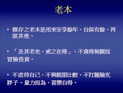 既是「老––」本,保本當是首務之急。冒險投資失利,翻本機會比不上年輕人,時不我與也。萬一動搖根本,悔之莫及。