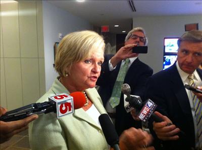 | Senator McCaskill fields questions from reporters before the RCGA meeting. (Credit Chris McDaniel / Beyond November) |