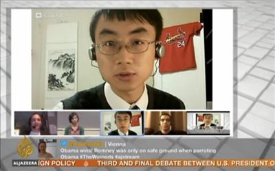 十月廿二日夜間,聖路易斯華盛頓大學中國學生學者聯誼會(CSSA)會長薛贇璐應半島電視台(Al Jazeera)英語頻道之邀,于直播採訪中評論奧巴馬與羅姆尼關於外交政策的總統辯論。