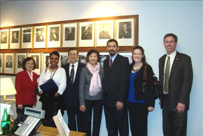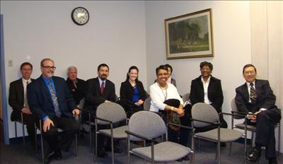 趙國盛委員就任後,聖路易郡郡長Charlie Dooley在郡長辦公室接見,予以勉勵,左起趙國盛,夫人Josephine,長子Jason,長媳Larissa及聖路易時報社長吳毓真