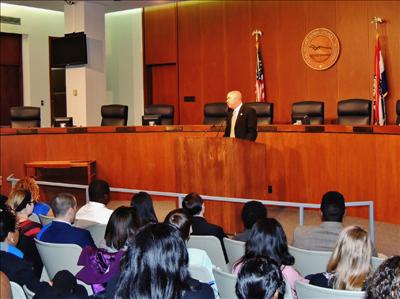 Congressman Clay addresses 2013 Congressional Youth Cabinet inductees and their families at the St. Louis County Government Center