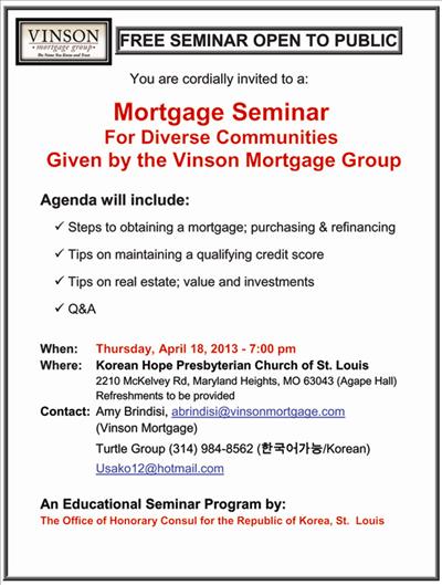 說明:Vinson房貸公司主講,敬備茶點招待洽詢電話:314-984-8562