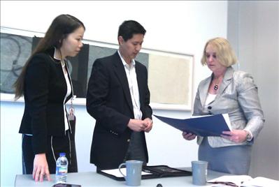 亞美商會會長李思源 Alex Lee,理事尤佳 Holly You向Betsy Cohen主任簡介亞美商會