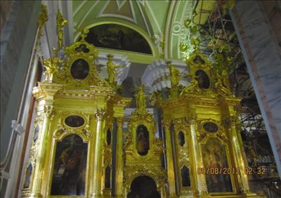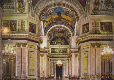 一宿無話﹐第二天早餐後﹐整裝去市中心參觀聖艾薩克大教堂。這所大教堂是沙皇亞力山大一世在1818年下令建造﹐直到1858年才完工。聖艾薩克大教堂是羅曼諾夫王朝時代最大的東正教堂﹐它的金圓頂成為聖彼得堡的市標。圓頂共有三層﹐內層高度210呎﹐外層高度310呎﹐頂層高度333呎。圓頂周圍裝有十二個天使﹐頂上有個東正教的十字架。東正教的十字架有別於天主教或基督教的十架﹐它有兩個十架﹐最上面的小十架指向天﹐代表聖父﹐中間的大十架代表聖子受難﹐最下面的斜小十架代表聖靈指向地面人類。頂層的圓頂是用200磅金子裝飾而成﹐內部則用馬塞克 (Mosaics)﹐聖徒像 (Icons) 和孔雀石 (Malachite) 所組成。教堂中間有六根巨型圓柱支撐著內、外圓頂。導遊小姐說教堂可以容納14000人﹐頂層和內層的壁畫記述著所有的聖經故事。