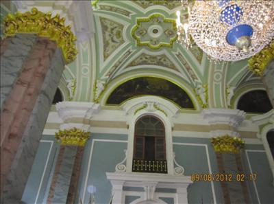 左邊的照片是聖艾薩克大教堂外景﹐融合了十八世紀巴洛克式和傳統羅馬式的建築。右面的照片是內部圓頂的壁畫﹐都是宗教的故事。下面三張照片的左邊是六根支柱的兩根(我的相機廣角不夠寬)﹐可以看出整