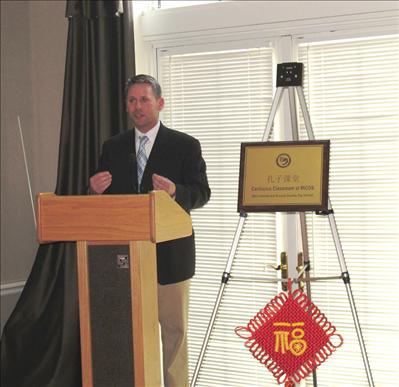 【聖路易時報記者黃育德報導】2013年4月24日下午五時,聖路易MICDS((Mary Institute and Country Day School)瑪麗康區地學校)沉浸在一片喜慶氣氛中,慶祝該校孔子課堂牌匾揭幕成立,這是繼聖路易大學附中之後在密蘇里州成立的第二所孔子課堂。 前密蘇里州州長Bob Holden、韋伯斯特大學孔子學院院長Debbie Pierce博士、副院長葛立勝博士、MICDS校長Lisa Lyle,副校長Jeff Suzik,外語系的系主任Patrick Huewe、中文老師林桂秀、書法家周信邦博士、聖路易中文教育界、僑界和MICDS中學師生百餘人歡聚一堂,共同出席了當天的揭幕典禮。