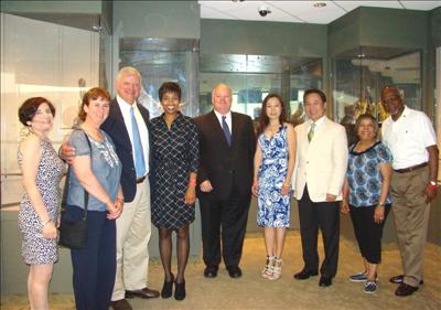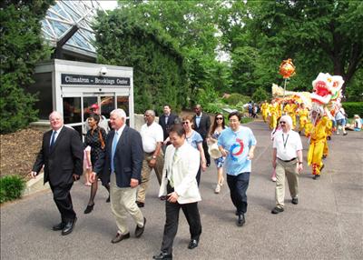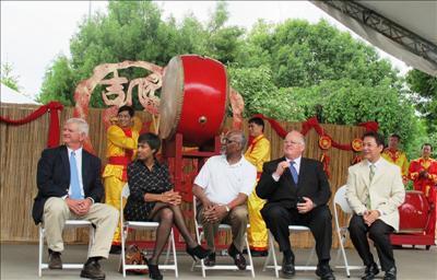 中華日貴賓,(左起)密蘇里植物園監事會主席Stephen Maritz、聖路易市市長辦公室特助Candace M. Dickson、聖路易郡郡長Charlie Dooley、密蘇里植物園園長Peter Wyse Jackson博士與中華日籌備會主席游開宇