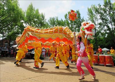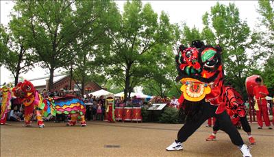 中華日於星期六上午,首先由聖路易現代中文學校與聖路易中文學校師生與家長在Spoehrer廣場共同演出鑼鼓獻技、太極、中國功夫與舞龍舞獅表演,給觀眾留下深刻印象。舞龍舞獅是華人重大節日時不可缺少的表演項目,今年的舞龍舞獅表演精彩,同時間有一大一小兩條龍的演出,其中,小龍隊伍是由聖路易大學附屬中學與聖路易中文學校學生所組成,他們有形有色的演出,十分活耀,這次小龍隊伍有來自聖路易大學附屬中學戴慶齡博士的七位學生,他們雖只利用課餘時間練習,但大家緊握龍桿熟記動作與連同中文學校學生的搭配,精彩表演讓觀眾讚不絕口。這項中外學生的舞龍表演,不僅讓他們了解到舞龍是傳統民俗,還能訓練學生體力、協調性以及讓學生了解合作的重要性。另外,由中文學校學生組成的舞獅隊,生動有趣的演出,也贏得連連的掌聲。