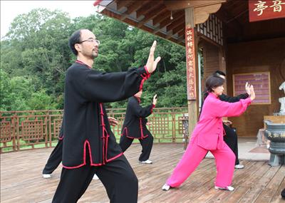 會員們身著統一的太極練功服,擺開架勢,熱身,踢腿,左右單擺蓮,雙擺蓮,烽火輪,龍形掌;不一會兒,便已大汗淋漓,開始了正式的盤架子; 只見他們個個疑神靜息,含胸拔背,全身放松; 雙手隨重心轉移而輕輕劃破空氣的阻力催向前方; 意念從腳到手,內氣鼓蕩其間;野馬分鬃,白鶴亮翅,白雲深處有人家; 高探馬,金雞獨立,心中氣概頂天地; 如封似閉,十字手,吞雲吐霧自有雄兵千百萬在胸;隨著一招一式的演練,會員們都進入了物我倆忘的境地。