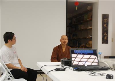 晨練結束,回到禪堂; 佛教會誌願者蔡先生已在等候。 蔡先生帶領大家參觀了禪堂, 地藏殿,和周圍的景觀; 介紹了佛教會的歷史。 美中佛教會是寺廟住持繼如法師於1995年創建; 很多建設和日常的維護都是靠誌願者們來完成。 經過十多年的建設,這里已成為一個佛學研究和禪修中心,並歡迎大家來這里參加禪修和觀光。
