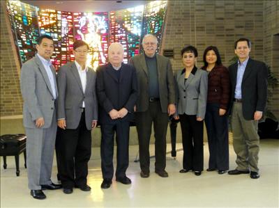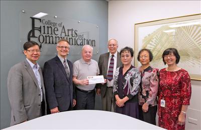 「中西經典、歲月甘泉」音樂會籌委會部分成員與UMSL交響樂團於四月二十四日在UMSL音樂系召開合作計劃會議,並與商學院馮鴻璣教授(左二)、音樂系主任Robert Nordman教授(左三)、樂團指揮Robert Howard 先生(左四)合影
