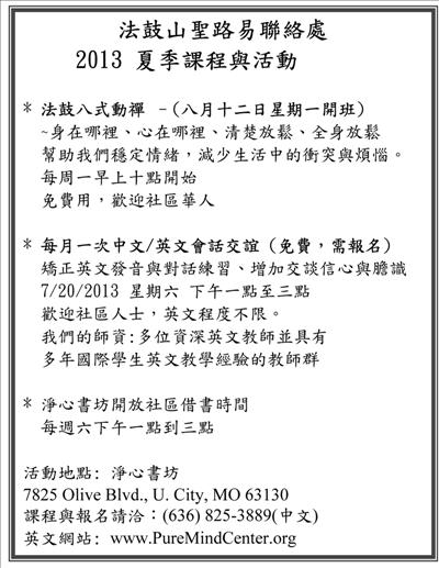 聖路易淨心書坊將於本星期六七月二十日下午一時至三時,舉辦每月一次的中英文會話交誼活動,免費提供社區人士中/英文對話與發音練習的機會,同時,增加中/英語交談的信心與膽識。此活動將以輕鬆活潑的日常生活中/英文對話為主,由Mr. Curtis Stwart 二十五年資深英文和傳播教學老師親自設計指導,並有多位具有國際學生英文教學經驗的師資群協辦。歡迎社區人士,踴躍報名參加。英文程度不拘,並備有精簡點心。