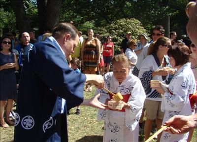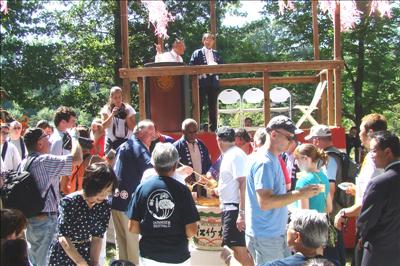 【聖路易時報訊】第37屆密蘇里州植物園日本祭8月31日至9月2日勞工節週末長假在密蘇里州植物園熱鬧舉行,萬餘人潮湧入,參與欣賞日本傳統文化風采。貴賓聖路易市市長Francis Slay,聖路易郡郡長Charlie Dooley,植物園園長Peter Wyse Jackson和來自芝加哥日本總領事館總領事吉田雅治(Masaharu Yoshida )遵循傳統儀式,身著日本和服外套共同持槌擊酒,將日本祭揭開序幕,所有來賓舉起清酒木杯乾杯慶賀,太鼓舞隨即擊打助陣,盛況滿園。