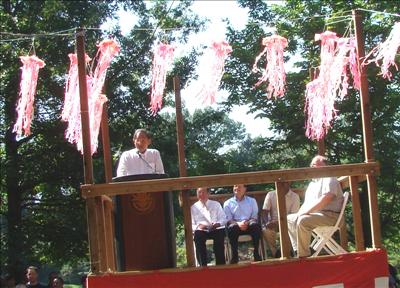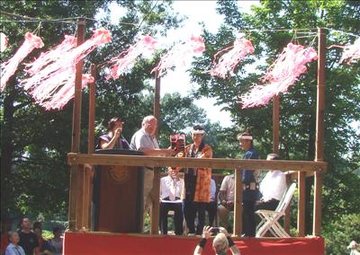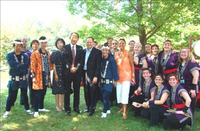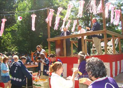 密蘇里植物園日本祭節慶8月31日一連三天熱鬧舉行,聖路易市長Francis Slay,郡長Charlie Dooley,園長Peter Wyse Jackson,總領事吉田雅治共同擊酒開幕