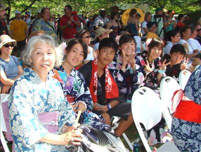 來自日本2011年海嘯地震災區的小學生們和老師(左)參與日本祭表演活動