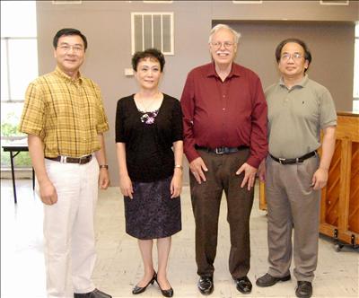 聖路易《中西經典、歲月甘泉》音樂會新聞發布會現場。上圖右一:旅美華人作家、《歲月甘泉》詞作者蘇煒;上圖右二:《歲月甘泉》海外總招集人陸成東;上圖右三:UMSL交響樂團指揮、本音樂會指揮 Robert Howard;上圖右四:聖路易斯《中西經典、歲月甘泉》音樂會總負責人閻明。