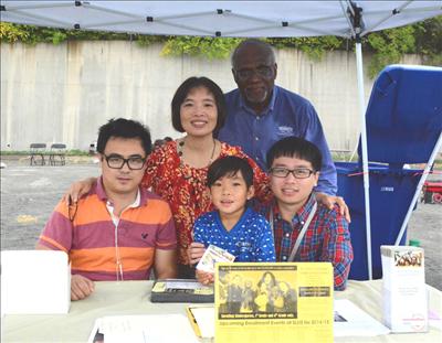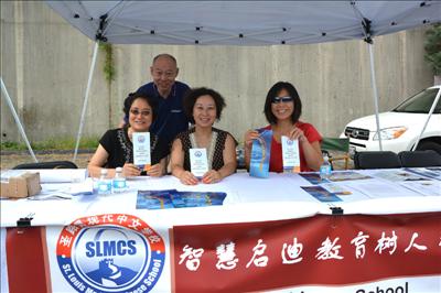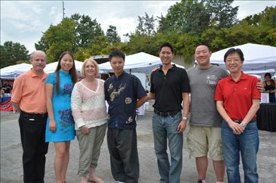 聖路易全浸中文學校攤位,陳秀玲校長(中)、聖路易郡郡長Charlie Dooley與全浸中文學校老師合影