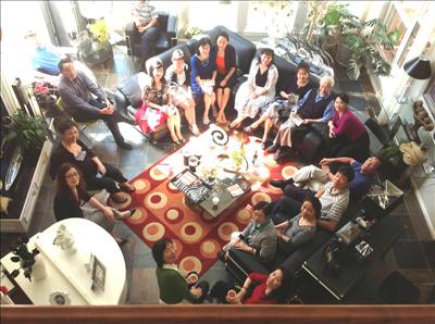 來賓享用了女主人准備和大家帶來的茗茶美食之後,在美麗的客廳裡圍坐開來。對我們來說,社區各種派對頻繁,可是這樣的主題書會,特別是與名家前輩零距離接觸,聽雜文家談雜文,彌足珍貴。女主人朗讀了從黃先生的雜文集 《閱世美文》中的兩篇雜文。雖然雜文不是朗誦的素材,可是聽來也是有聲有色,特別是那詼諧辛辣的語言,文中涉及的為人熟悉的世事,使大家興趣陡增。