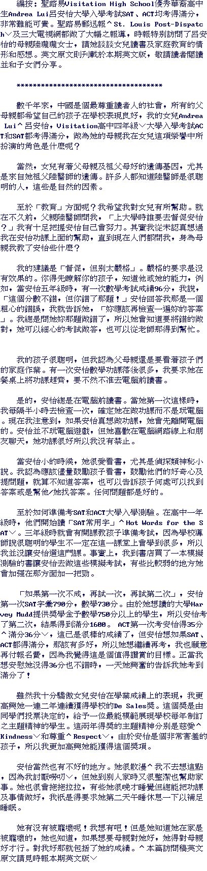 For thousands of years, scholars have ranked at the very top of Chinese society. And so, all Chinese parents want their children to do well in school. And since, it is my daughter, Andrea Lui, who made perfect scores on both the ACT and SAT (college entrance exams), what role, if any, did I play in her achievement?