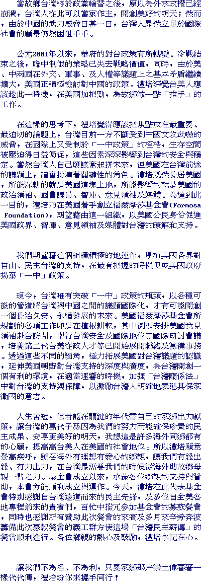 Formosa Foundation Banquet Charles F. Knight Executive Center Washington University - St. Louis August 11, 2002 Keep Taiwan Safe - and American Strong Li-Pei Wu Founder & Chairman, Formosa Foundation