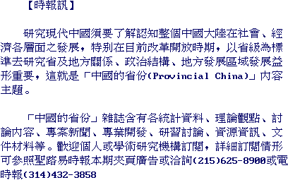 Provincial China contains sections on statistics, theoretical perspectives and discussion, news of projects in progress and professional activities, conferences, workshops, information about sources, documents and materials, and ideas and information about provinces in general. In addition, it accepts research articles and notes about any aspect of China's provinces.