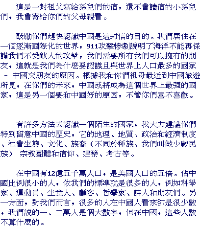 The purpose of this letter is to encourage all of you to study up on China as much as you can. The reason is that we live in an increasingly internationalized world. The tragic attacks of Sept. 11 show that the oceans no longer protect us from our enemies. We need all the friends abroad we can get. To that end we should study to get along with China, the most populous country in the world. Based on your grandmother's and my recent trip to China, it may also become the most powerful country in the world during your lifetime. Another reason for getting along with China, like it or not!
