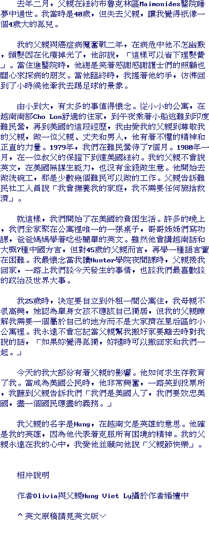 My Dad's first name is Hung which is "Hero" in Vietnamese and he is truly my Hero because he represents the human spirit by overcoming all odds. My Dad is always with me in spirit and in my heart. I love you and Happy Father's Day, Dad.