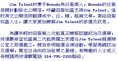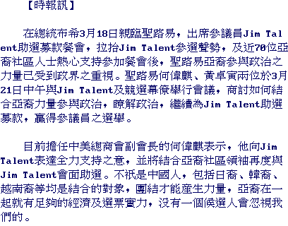 Led by Francois Ho, Thomas Wong and Matthew Yu, about 70 Asian, including Chinese Americans, Taiwanese Americans, and Vietnamese Americans joined the March 18 fund-raising dinner party at America Center to show their support to President Bush and Jim Talent. Ho, Wong and Yu were invited to a private party to meet with the President Bush before the dinner.