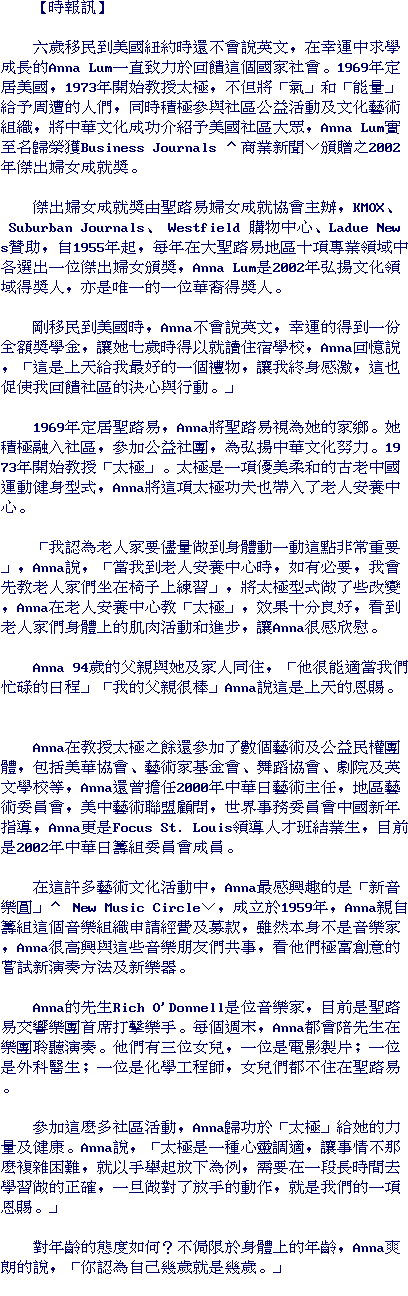 Culture Awareness 2002 Woman Achievement Award: Anna Lum