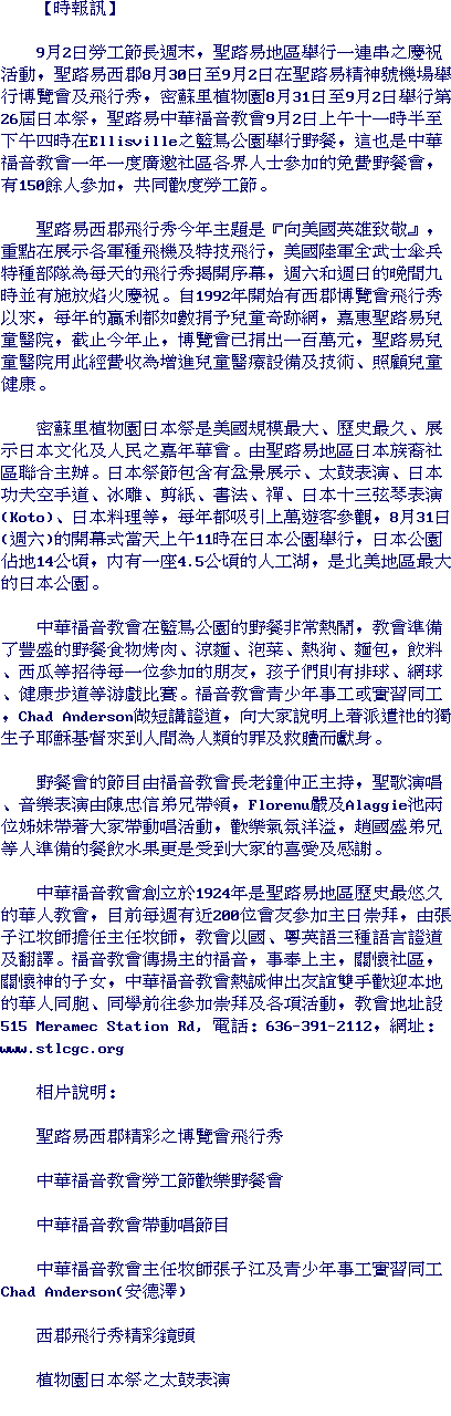 Labor Day Celebration in St. Louis St. Louis Chinese Gospel Church Picnic St. Louis County Fair and Air Show 26th Annual Japanese Festival at Missouri Botanical Garden