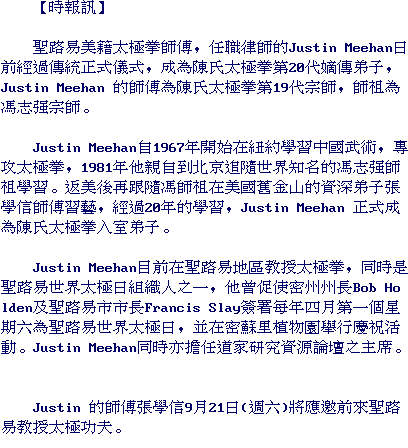 Further information is available on his website: www.StlTaiji.com. He is bringing to St. Louis his Shir Fu, Master Zhang Xue Xin to teach Taiji Saturday, September 21, 2002.