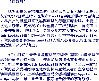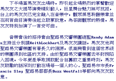 a very gifted artist and an exciting evening to be remembered for a long time. At the reception following the concert, one woman said, "His face is full of expression. He seems to be taken over by the music."