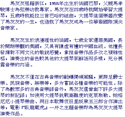 Mr. Ma is the winner of multiple Grammy Awards and has record sales in the multi-millions. He is one of the most recognized names in music today. The score for the movie, "Crouching Tiger Hidden Dragon", was composed by Tan Dun and featured a passionate new performance by Yo-Yo Ma. "Silk Road Journeys: When Strangers Meet" is a debut album from Yo and the Silk Road Ensemble.