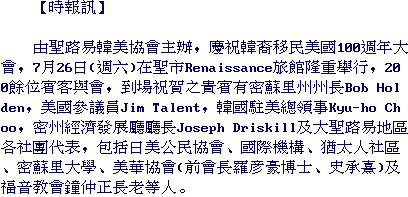 One of the objectives of Organization of Chinese American (OCA) is to reach out to the community and various ethnic groups. With that objective in mind, OCA participated in the Centennial Celebration of Korean Immigration History sponsored by the St. Louis Korean American Association on Saturday, July 26. An elaborate banquet, music and dance programs were prepared for that occasion at the Renaissance Hotel. Over 200 guests attended the event. They included Governor Bob Holden, Senator Jim Talent, Economic Development Director Joseph Driskill, Hon. Kyu-ho Choo, Consulate General of Republic of Korea and representatives from the Japanese American Citizen League, International Institute, the Jewish Committee, University of Missouri-St. Louis, and others. Representing OCA were Dr. Harold Law, past president of OCA St. Louis Chapter in 1995 and 1996 and Mrs. Matthew Yu. Her husband Matthew, current president of OCA St. Louis Chapter, was unable to attend due to a schedule conflict. Attended were also Mr. and Mrs. Eugene Hong from the Chinese American community. Eugene was born and raised in St. Louis. His wife, Ann, is from Korea.
