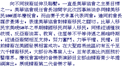 The event was sponsored by major industries such as Anheuser Busch Company, The Boeing Corporation, Enterprise Rent-A-Car, Covenant Financial Mortgage Services, Paul, Camazine & Blumenthal Law Firm and friends of Korean-American Association of St. Louis. The music program was totally performed by the youth. There are many musical talents among the younger generation in the Korean American community in St. Louis.