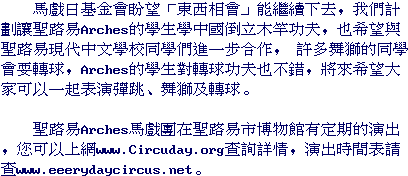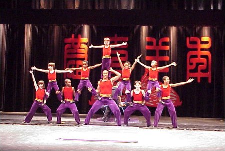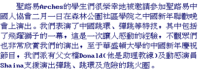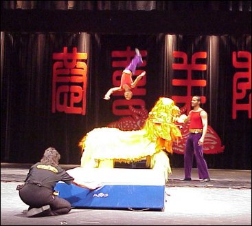 The St. Louis Arches were also honored by being asked to be part of the St. Louis Chinese Association's Chinese New Year Celebration on Feb. 1 at Forest Park Community College. The Arches performed their Chinese Hoop Diving and mini-trampoline acts ---including the sensational somersaults over the Chinese Lion. It was a great experience for the Arches and the audience seemed to really enjoy their performance. For the Washington University Chinese New Year Celebration, the Circus Day Foundation provided the father and daughter team of Dangerous Donald (assistant coach of the Arches) and the Sensational Shaina (one of the Arches) performing tumbling, rolla bolla, rolling globe and elevated hoop diving--- including a dive through a hoop of fire.