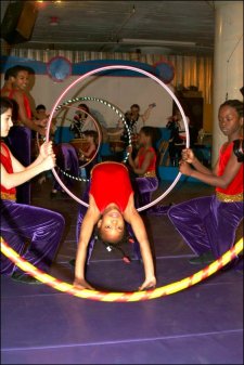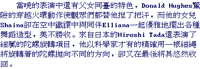 Donald Hughes, assistant coach with the Arches, also presented his various skills, such as juggling, mini-trampoline, and rolla bolla. His daughter Shaina, a young member of the St. Louis Arches, performed gracefully "Lyra" with another Arch Elliana. Both girls managed to pose beautiful ballet gestures within a small trampoline hung in the air.