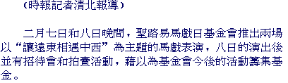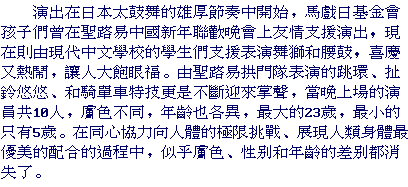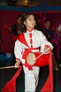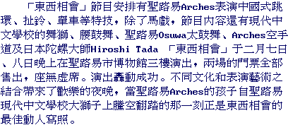 "Far East Meets Midwest" was a program to bring together Asian and Midwestern arts and artists. The program started with the performance of Taiko drums, an indigenous part of the Japanese culture dating back more than 1,400 years. During this year's Chinese Spring Festival, which was around February 1st, performers from the Foundation were invited to join local Chinese community to celebrate the coming of the Year of Sheep. On the nights of the 7th and 8th, Lion Dancers and Waist Drummers from the St. Louis Chinese Modern School also participated in the Circus Show. Their presentation combined elements of dance, music, martial art, and traditional Chinese costuming and choreography, creating a wonderful festival atmosphere.