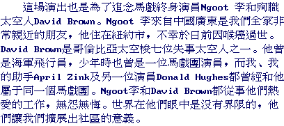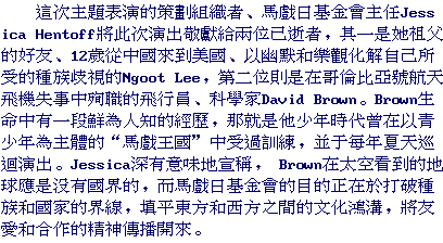 According to Jessica Hentoff, the Foundation's artistic and executive director, this program was dedicated to the memories of Ngoot Lee and David Brown. Lee was a Chinese American artist who came from Canton and died recently of cancer at the age of seventy. Despite the pressure that racial prejudices exerted upon his life, Lee maintained his positive and cheerful outlook. He made friends with people of all nationalities and backgrounds. David Brown was one of the seven people on board the space shuttle Columbia. He had also been a tumbler, juggler, unicyclist and stilt walker when he was young. He had traveled with young people across the country, using circus to bring a message of brotherhood and joy. Hentoff meaningfully stated that our earth seen from the space had no boundaries, and the purpose of the Circus Day Foundation was to use Circus arts to break barriers and connect communities.