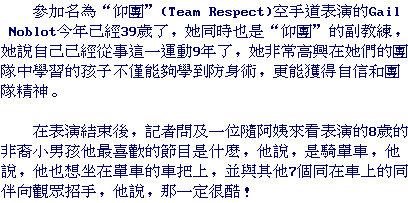 Other performance included Team Respect from Amanat's Karate Center and top spinning by Hiroshi Tada. Gail Noblot, 39, assistant coach of Team Respect, had been practicing for nine years. She was happy that she had the opportunity of teaching children and adults not only about self-defense but also about team-working spirit. Hiroshi Tada, affiliate professor of mechanical engineering at Washington University, manipulated a plain, primitive toy top with a rope using some elements of juggling and yo-yo. He demonstrated the art of Koma-Mawashi (Top Spinning) with scientific accuracy and received huge applause.