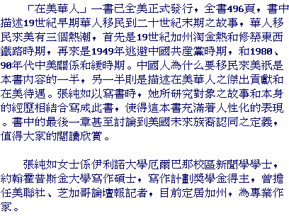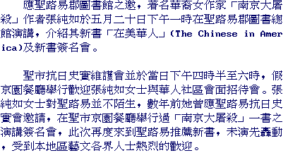 St. Louis County Library Headquarters Tuesday, May 20, 1:00 p.m. Author Iris Chang discusses her newest book - The Chinese in America: A Narrative History (Viking Press, April 2003).